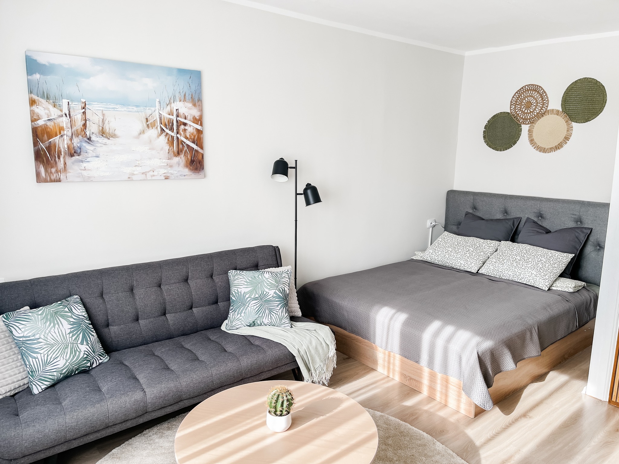 Selle stuudiokorteri sisustamisel oli eesmärgiks luua mereäärsele asukohale omane rahulik ja looduslähedane atmosfäär. Omaniku poolt oli olemas baasviimistlus, millele lisasime täiemahulise sisustuslahenduse alates suurest mööblist kuni dekoratiivsete detailide ja täisvarustuses kööginurgani. Projekt hõlmas planeerimist ja korteri lõplikku ettevalmistust külaliste majutamiseks. Tulemuseks on kompaktne, kuid funktsionaalne puhkekorter, mis pakub külastajatele kodust mugavust ja läbimõeldud disaini.